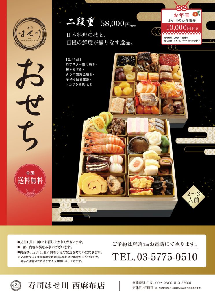 お正月の席を華やかに彩る、はせ川の味をご家庭でお楽しみいただけます。